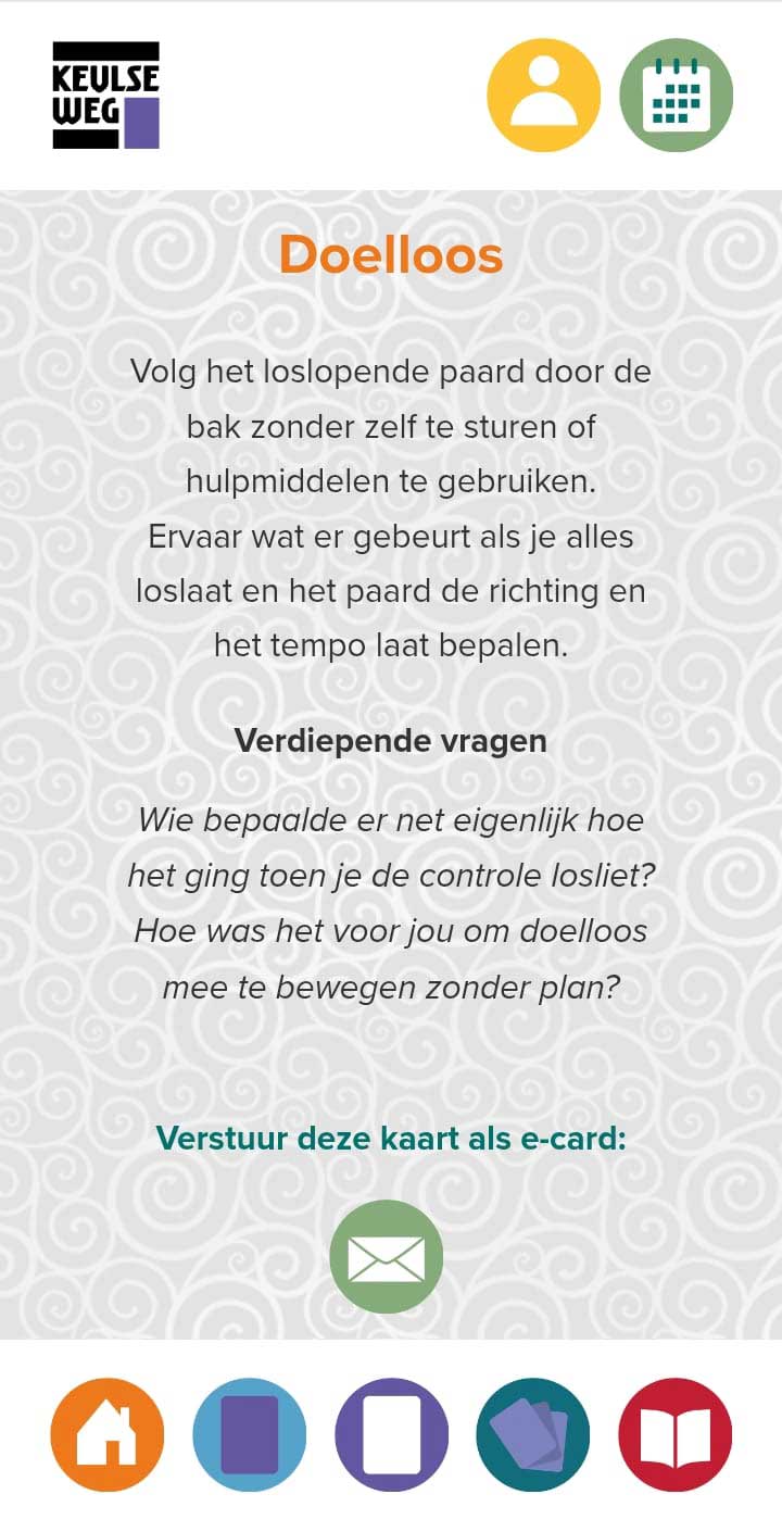 De activiteiten die bij de kaarten horen sluiten aan bij het thema van de kaart. Ze zijn bewust eenvoudig gehouden en bedoeld als ingang om het ervaringsgerichte proces in beweging te brengen.