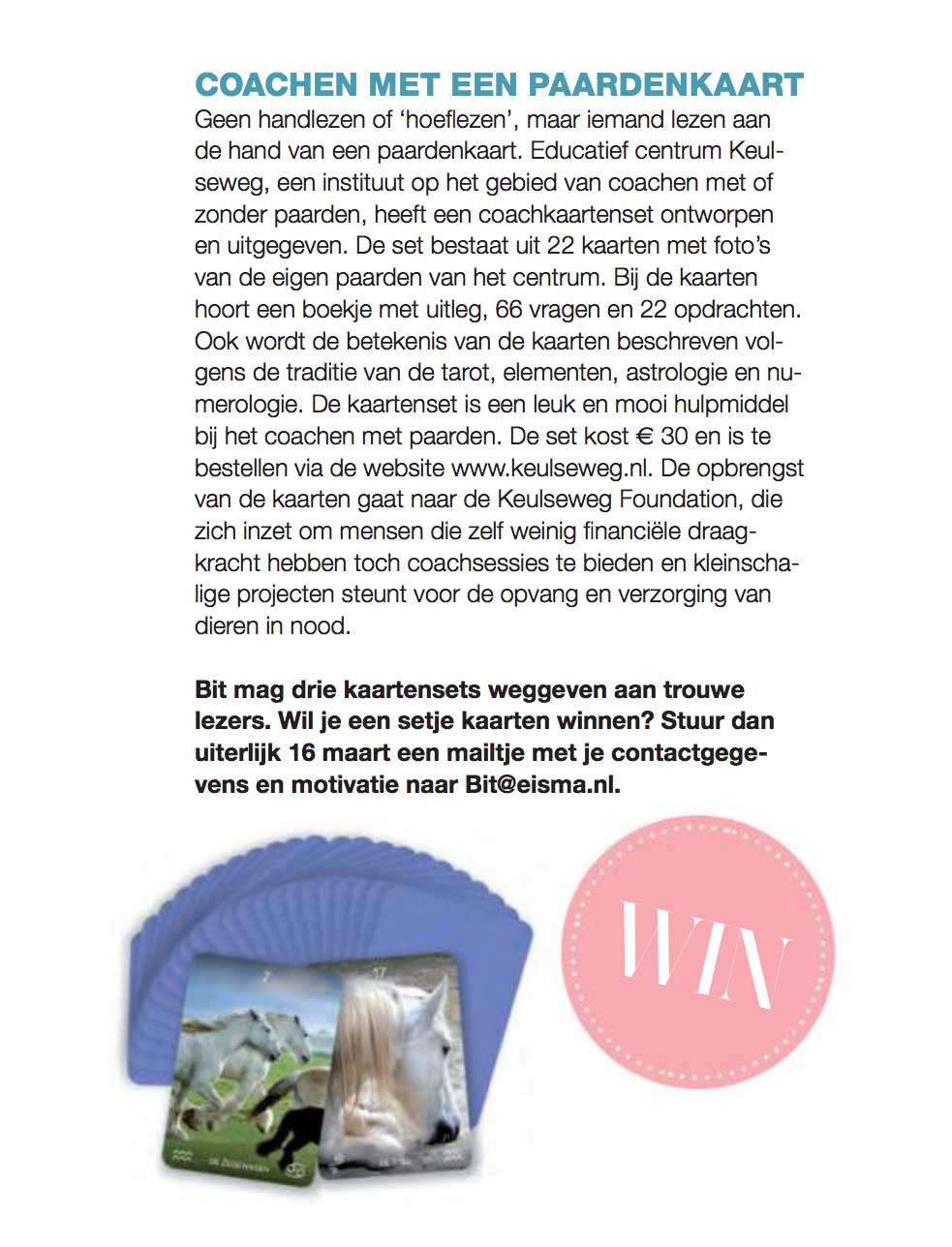 Wat ontzettend leuk! In de rubriek Bit uit en thuis in Bit magazine staat een stukje over onze coachkaarten. Ze vroegen ons een set beschikbaar te stellen voor de winactie die aan het artikeltje gekoppeld is. We maakten er drie van en als je een daarvan wilt winnen stuur dan uiterlijk 16 maart een mailtje met je contactgegevens en motivatie naar Bit@eisma.nl.